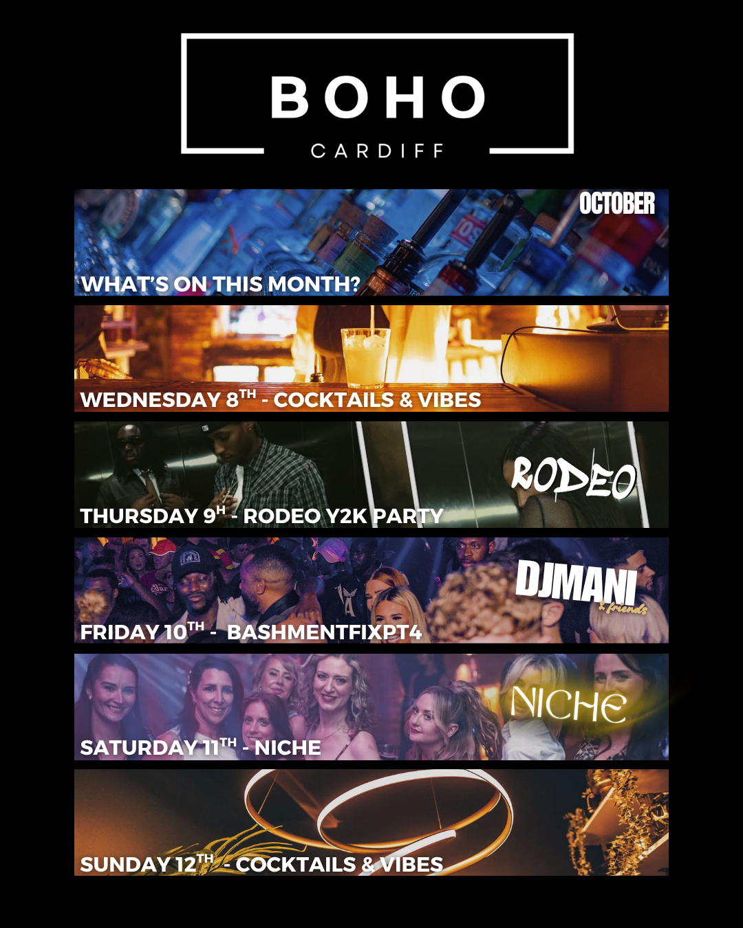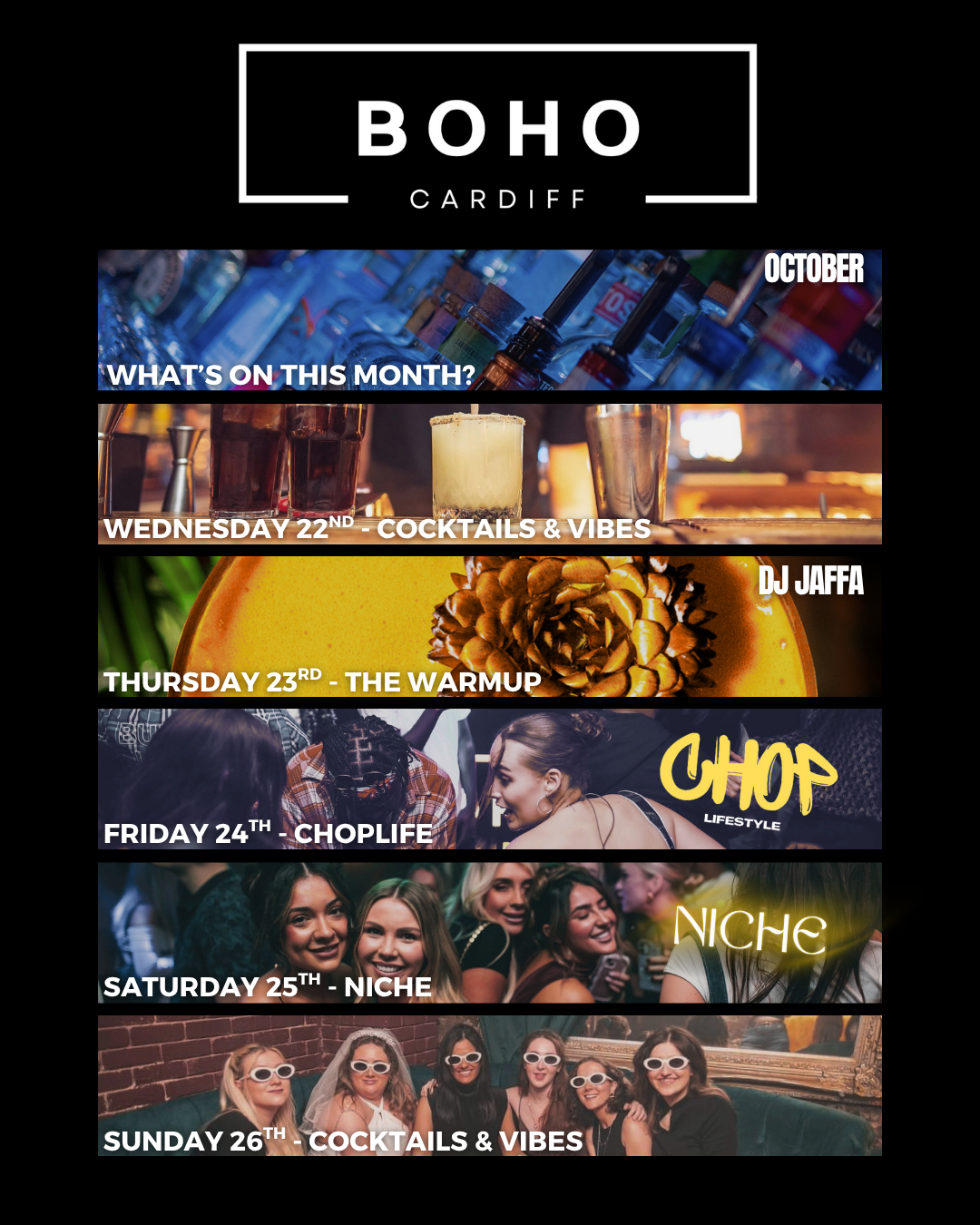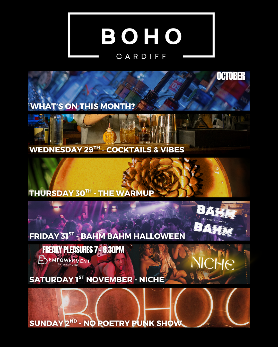 Hidden beneath Cardiff Market, Boho is your go-to for bespoke crafted cocktails, unforgettable nights, and a weekly rhythm that hits different. Starting on Wednesday's we ease into the week, Thursdays are The Warmup for our weekend with drinks deals all night and a DJ from 8pm. Fridays and Saturdays? We party until 4am with Event takeovers on Fridays and our club night Niché every Saturday. Sundays are for industry deals and unwinding ready for the week ahead. From laid-back drinks with the gang to full-blown parties and everything in between, Boho isn’t just a bar - it’s a scene. No two nights are the same. No labels, just vibes.