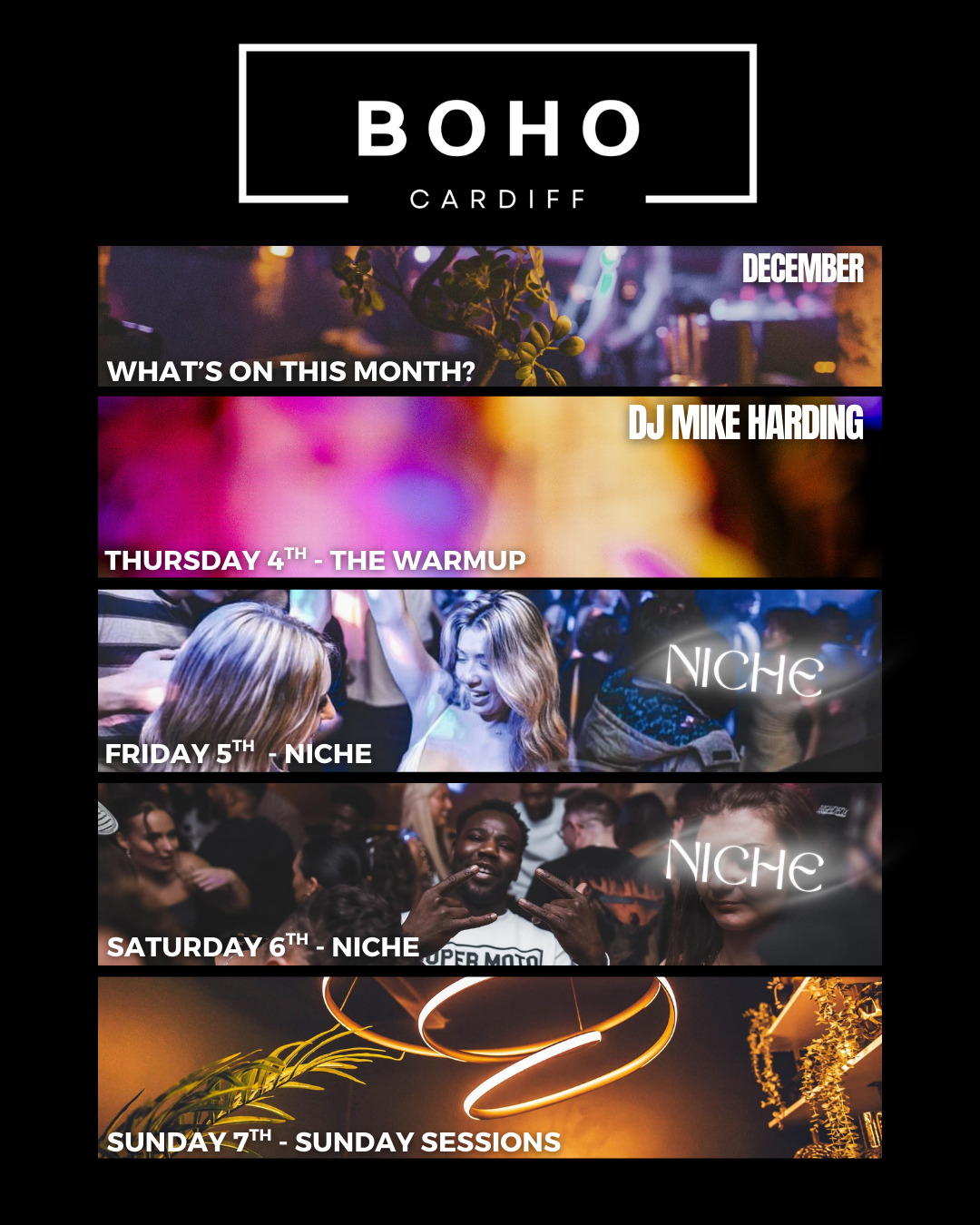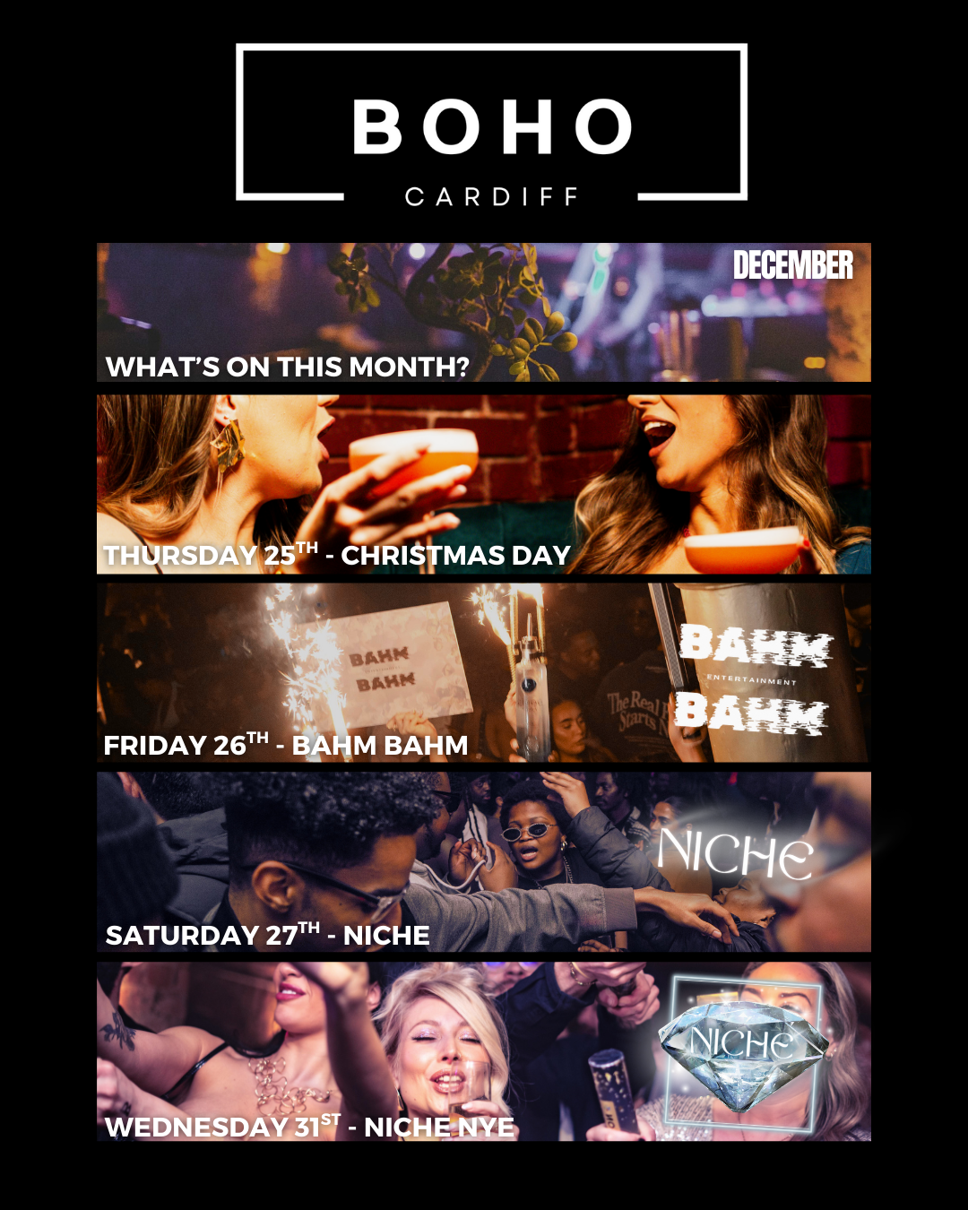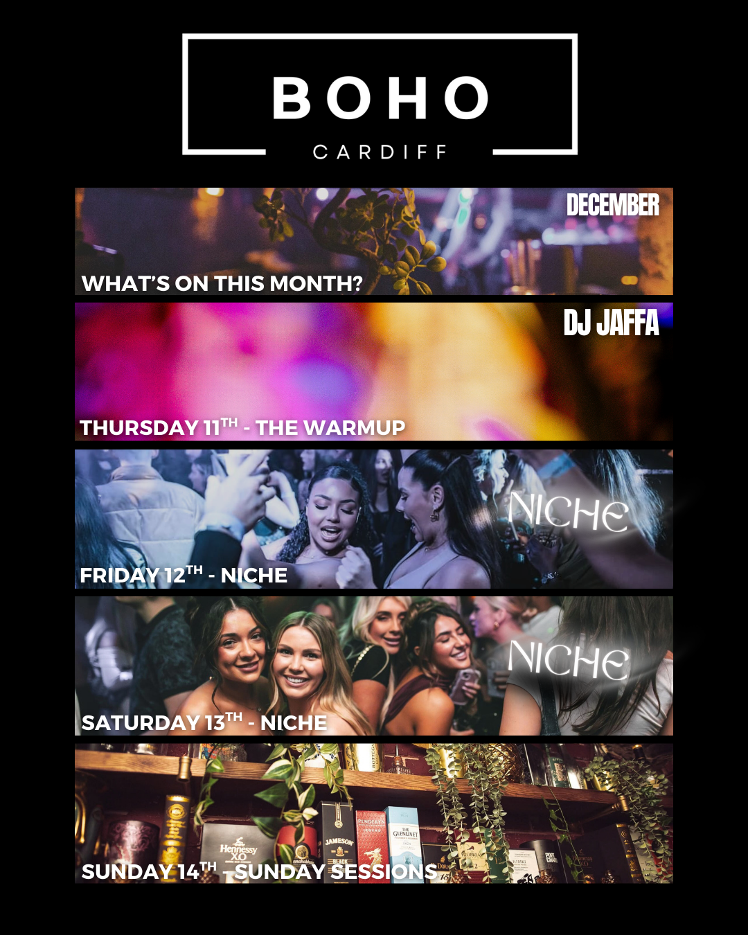 Hidden beneath Cardiff Market, Boho is your go-to for bespoke crafted cocktails, unforgettable nights, and a weekly rhythm that hits different. Starting on Wednesday's we ease into the week, Thursdays are The Warmup for our weekend with drinks deals all night and a DJ from 8pm. Fridays and Saturdays? We party until 4am with Event takeovers on Fridays and our club night Niché every Saturday. Sundays are for industry deals and unwinding ready for the week ahead. From laid-back drinks with the gang to full-blown parties and everything in between, Boho isn’t just a bar - it’s a scene. No two nights are the same. No labels, just vibes.